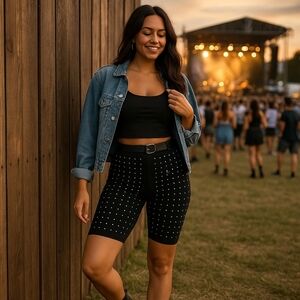 Turn heads with these Sterling Kreek “Rainy Night” studded biker shorts! Sleek black stretch shorts with eye-catching silver rhinestone embellishments all over the front. Perfect for concerts, festivals, or a bold street-style look.
