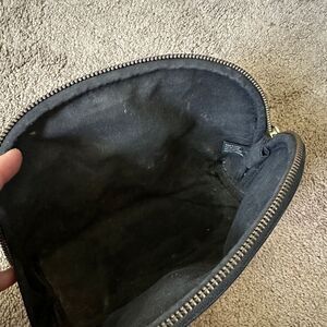 In good used condition. A few small signs of wear on the outside and inside does have makeup residue. Still has lots of life left though. Bright shiny red quilted material with gold hardware and logo. Measures approx 8.5”x 3