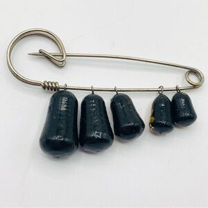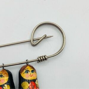 Unique and collectible vintage brooch featuring five miniature wooden Russian Matryoshka nesting dolls dangling from a large silver-tone safety pin clasp. Each doll is hand-painted in black, gold, and red with charming folk art details.