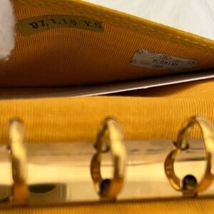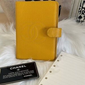 Chanel Caviar Agenda PM with Authentic Chanel COA,Hologram,Certification,Serial Code,original slot protector.Interlocking CC embossed agenda in iconic mustard yellow caviar leather.Timeless,sophisticated agenda in excellent condition.Caviar leather has no rips,tears,loose missing stitching.One almost imperceptible mark on front edge snap closure so tiny,it’s hard to see but wanted to point out(pic 3,4).All edges intact,no rubs.Front snap strong,opens to reveal two open slots on left interior side,with additional large right sided slot,easily fits passport or receipts,license,credit cards.Here’s where you’ll also find CHANEL hologram and serial number(pic12,16).Shiny gold toned six ring binder, open pen loop,no scratches,operates flawlessly.This gorgeous agenda looks as though hardly ever used,is a sought after addition for any lover of Chanel.Comes with a new set of unbranded paper inserts