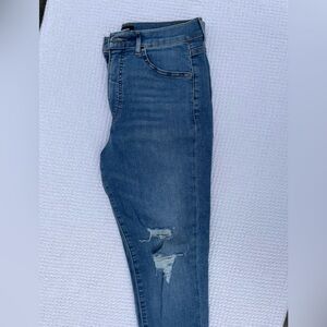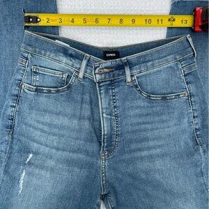 Super stretch skinny jeans by Express. Classic blue denim. Features distressed details.