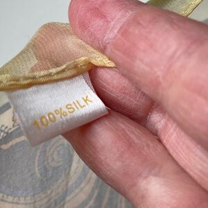 A sheer, lightweight paisley print sarong or scarf, commonly made from silk. It features a multi-colored paisley pattern in warm earthy tones and can be used in various ways, such as a beach cover-up, a shawl, or a headscarf.
