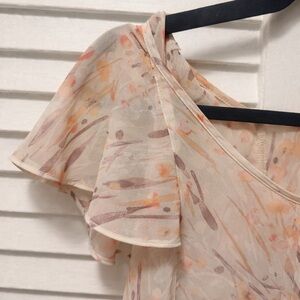 Soft, feminine blouse in a lightweight, semi-sheer fabric with an abstract floral print in warm peach, coral, and neutral tones.