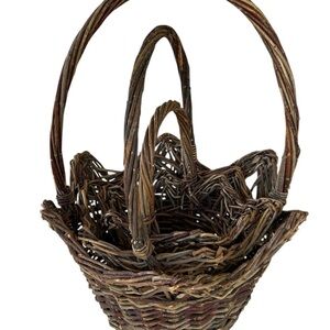 Beautiful set of three wicker hand made vintage baskets. Perfect for home decor or storage. Features a natural brown color.