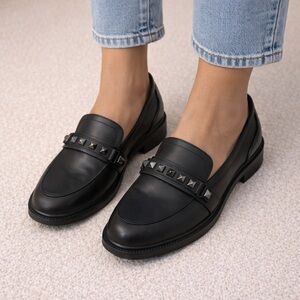 studded loafers, black leather loafers, marc fisher shoes, edgy loafers, slip on flats, workwear shoes, office chic footwear, modern preppy style, minimalist shoes, everyday flats, fall footwear, polished casual shoes, classic with edge, capsule wardrobe shoes, street style loafers, timeless footwear, professional casual style