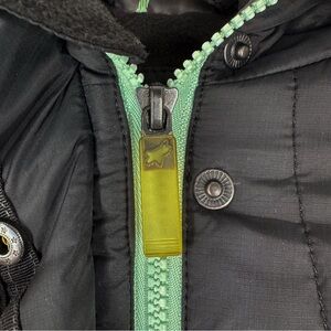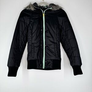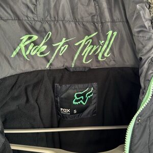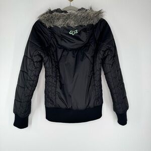Great condition Fox Racing Black with Mint Green Detail Hooded Puffer Jacket. Zip and snap button closure. Ribbed stretch waist and cuffs. Faux fur lined hood. Two waist pockets. One inside pocket. Please see all pictures!