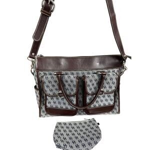 Vintage Dooney & Bourke Double Pocket Tote in navy monogram canvas with brown leather trim. Includes matching pouch + registration cards.