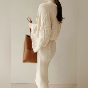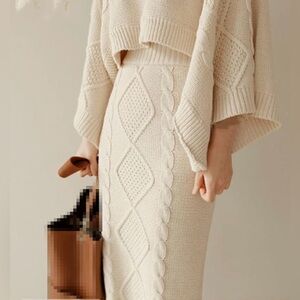 Elevate your wardrobe with this chic two-piece sweater set, featuring a relaxed-fit, ribbed knit pullover top with long wide sleeves, paired with a figure-hugging, elastic high-waist midi skirt.