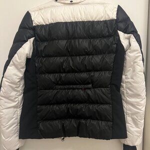 Black and white nylon (Shell: 100% Polyester, Padding: 100% Duck Down). Jacket. Long sleeves. Hidden front zipper closure. Front pockets. 24" from shoulder to hemline. Imported.