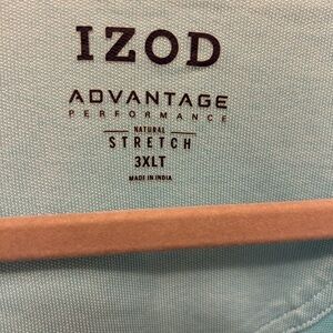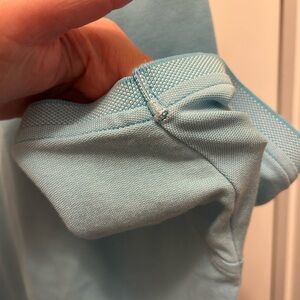 Classic Izod polo in light blue. Features a comfortable fit. Ideal for everyday wear. There appears to be a light ink stain on the front and a small worn spot on the underside of one sleeve. Smoke free home.
