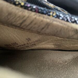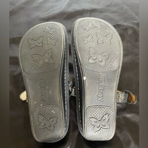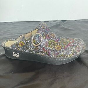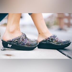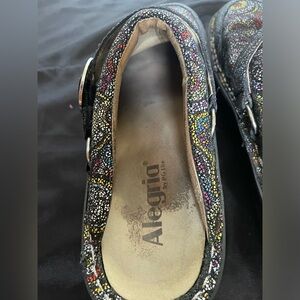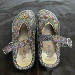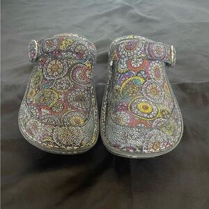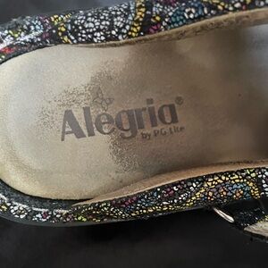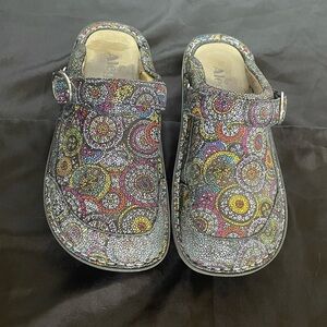 These Alegria Seville Spiro Multi Clogs are a great slip resistant pair of shoes. They are size 38. Some of the padding is showing inside the left shoe. They are worn, but the soles are still in great condition and the insoles are replaceable.
