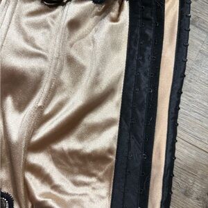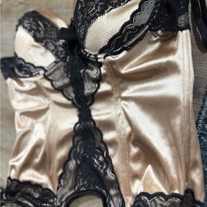 This stunning bustier features a luxurious tan satin fabric with elegant black lace detailing. Perfect for adding a touch of sophistication to your intimate wear collection.