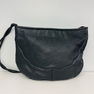 SHARIF. Made in the USA. Black pebbled leather exterior, lined with black fabric. Single interior zippered pocket. Single shoulder strap made up of two stands twisted together. Bag closes with a zipper closure. Preloved/vintage items may show signs of wear from age and use as well as a “vintage scent” so please keep that in mind- excellent vintage condition, MINOR tear in the exterior which is hard to notice but worth mentioning. Please see photos!