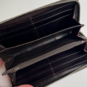 The exterior was refreshed with paint. Clean inside and outside. Coin section has some tears. There is tarnish on zipper teeth