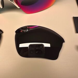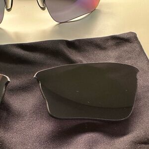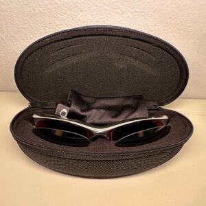 These have light scratches in frame and lenses, as well as light wear in rubber. Otherwise in great condition! See pictures. Includes polished aluminium color plastic frame with two pairs of lenses, hard case and soft case as pictured.