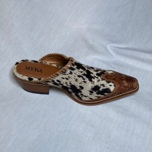 The Myra Bag Heely Western Hand-Tooled Mules are slip-on shoes crafted from genuine hair-on leather and hand-tooled leather in a classic western style with a 2-inch heel. Each pair features a unique cowhide pattern due to the natural material variations.