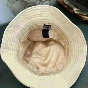Madden NYC bucket hat White with gold trim and logo. Please see photos for details and conditions. Open to offers. Fast shipper. Has a small stain on top as shown in photo. Price reflect flaw.