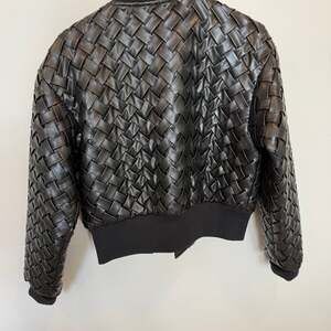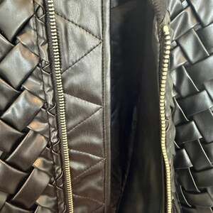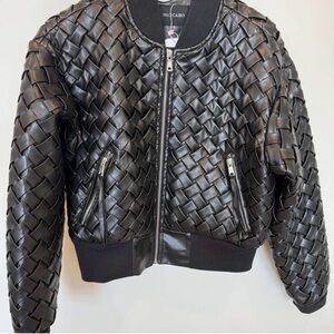 Dolce Cabo Faux Leather Woven & Heart Quilted Bomber Jacket, Women's Size M. This unique statement piece features a lattice woven texture throughout the exterior and a heart-patterned quilted lining.
