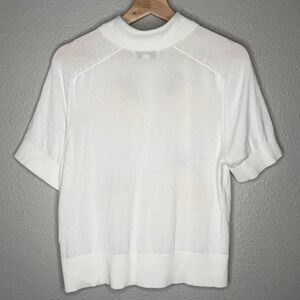 Free Assembly women's white knit button-up top with lemon print detailing. Short sleeves with collar and soft knit construction. Clean, minimal silhouette with clean girl, cottagecore, and soft minimal aesthetics. Button front closure with ribbed hem and sleeves.
