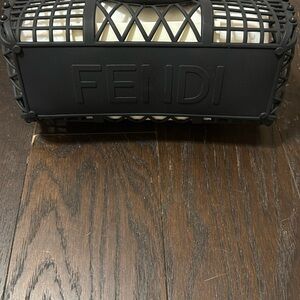 Stylish Fendi basket bag in black with a gold emblem. Perfect for a chic look. There a few subtle scuffs on the bag. The bag is authentic and comes with dust bag and box.