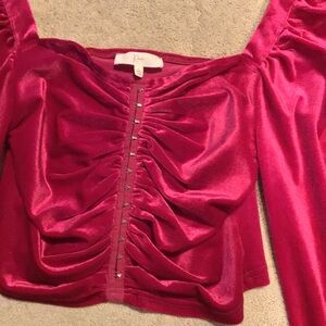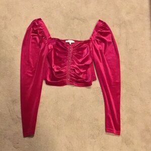 Elegant pink velvet top with long sleeves. Features a stylish ruched front.