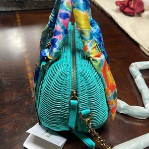 Vibrant turquoise satchel. Features colorful scarf handles. Gold-tone embellishment.