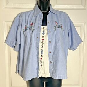 Keywords: embroidered, birdhouse, garden, cottagecore, whimsical, button front, summer, casual, light blue, button down, short sleeve, women's shirt, country chic