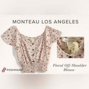 Beautiful Monteau Los Angeles floral off-shoulder blouse featuring a soft lightweight fabric, feminine floral print, button-front detail, flutter sleeves, and a flattering smocked waist. Perfect for spring and summer outfits—easy to dress up with jeans or skirts.