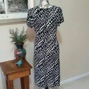 Great easy wear and care polyester/spandex. Cute black and white print....there is a white cami on the manequin......this does have a V neck.