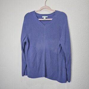Keywords: Coldwater Creek sweater, women's purple sweater, plus size sweater 2X, V-neck knit top, long sleeve pullover, ribbed texture sweater, chevron pattern sweater, comfortable knitwear, casual women's top, classic V-neck sweater, soft cotton blend
