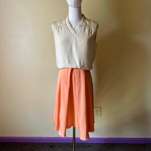 Authentic 1960s designer dress by Morton Myles for Malcolm Charles — a standout piece of mid-century mod fashion. Features a cream V-neck bodice with gathered shoulders and a contrasting orange A-line skirt. Finished with a Talon back zipper closure, this rare colorblock design captures the minimalist sophistication of the era.