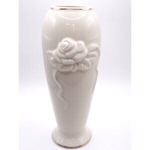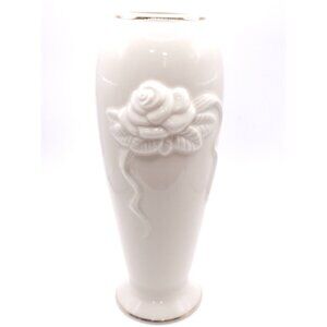 Elevate your space with this elegant white ceramic vase featuring an embossed rose design and gold trim, blending timeless charm with sophisticated style.