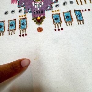 Vintage Myo Piñon Clothing Women’s Aztec Southwestern Off White Long Sleeve Shirt is in good preowned condition. There is a very small spot on the front of the shirt that can likely be laundered. This top is beautiful with intricate detailing in the design. There is no size listed but based on measurements it should fit up to Large or XL.