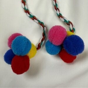White sleeveless top featuring vibrant machine embroidered patterns. Colorful pom-pom ties add a playful touch.