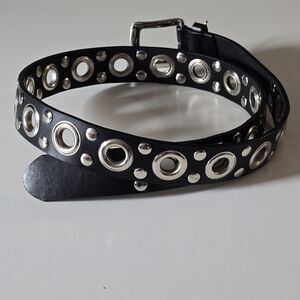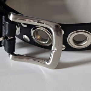 Stylish black belt with silver grommet details. Perfect for adding an edgy touch to any outfit