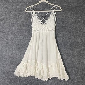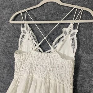 Elegant white mini dress with lace detailing. Spaghetti straps and flowy skirt. Perfect for summer outings.