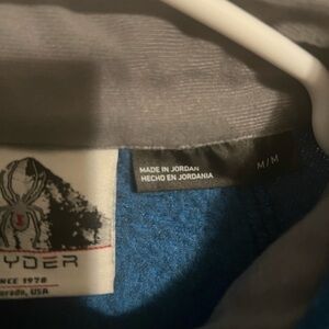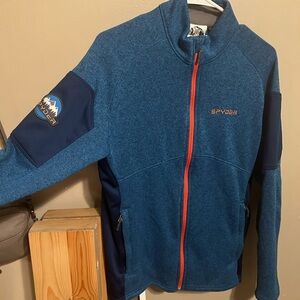 Spyder jacket in blue and navy. Features zippered pockets and logo on chest. Ideal for casual wear.