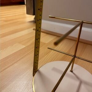 • Material: Gold-tone metal arms, glossy round base with logo