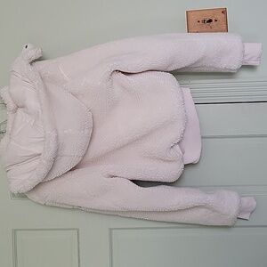 Soft and cozy sherpa jacket. Features zipper pockets and a hood. Perfect for keeping warm.