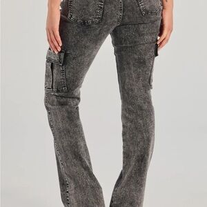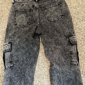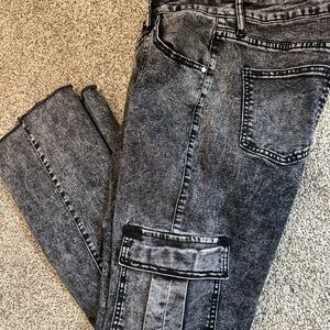 Trendy gray straight leg jeans. Features cargo pockets. Ideal for casual style.