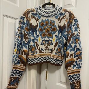 Chic and vibrant sweater with intricate patterns. Features blue and brown hues. Ideal for a stylish look. No pilling or holes.