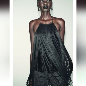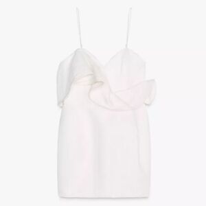 This elegant white dress features a stylish ruffle design, perfect for any occasion. Its sleek silhouette and delicate straps offer a sophisticated look.
