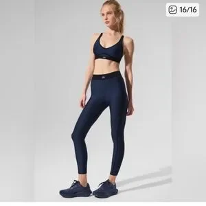 Sleek navy leggings with matching bra. ALO AIRLIFT 7/8 LEGGING SET IN NAVY BLUE XXS. Comfortable fit. Perfect for yoga or casual wear.