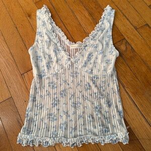 Charming floral tank top with lace trim. Features a delicate blue floral pattern on a white background.