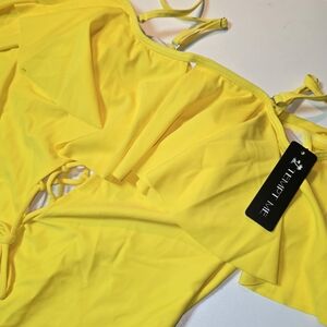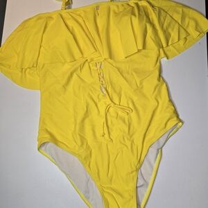 Bright and cheerful yellow one piece swimsuit with playful ruffles. Perfect for sunny days at the beach or pool.