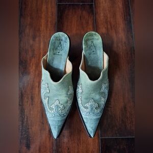Old Gringo Mules Women Sz 9.5 B Leather Point toe Mid Heel Western. Pre-loved, in good condition overall. These are almost like a green/gray Distressed style Mules.