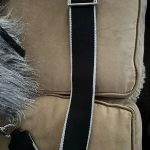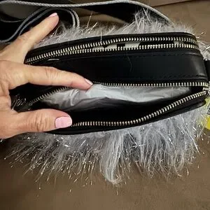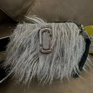 Add flair with this silver fur crossbody. Features a bold metallic accent.