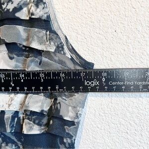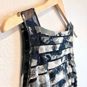 This Adrianna Papell dress is a black floral sheath style with a square neckline and sleeveless design. It features ruffle accents, a zipper closure, and is knee-length. Made from a polyester blend mesh fabric, it is lined and lightweight. Suitable for formal occasions like weddings and parties, this size 8 dress is perfect for summer, fall, and spring wear.