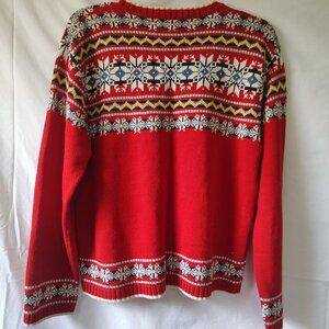 It is a thick red sweater in medium size. It is made of Linen and cotton. PTP is 20" and the length is 22"