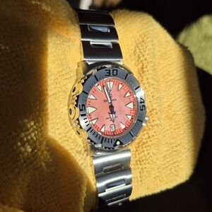 Here is lightly worn Long Island Watch Co ISL-142 "Monster" dive watch with pink mother of pearl dial. This watch is great quality in every detail including solid end links and milled clasp. Long
